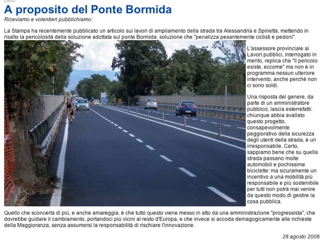 Sono passati venti anni da quando nell’agosto 2006 cominciammo come associazione FIAB a denunciare il sopruso - che già sembrava configurarsi anche come abuso - della mancata messa in sicurezza di tutti gli utenti della strada con il farraginoso raddoppio delle corsie automobilistiche sul tratto Marengo-Alessandria della exSS10, rendendo molto pericoloso il transito dei cittadini in bicicletta soprattutto sul ponte Bormida.